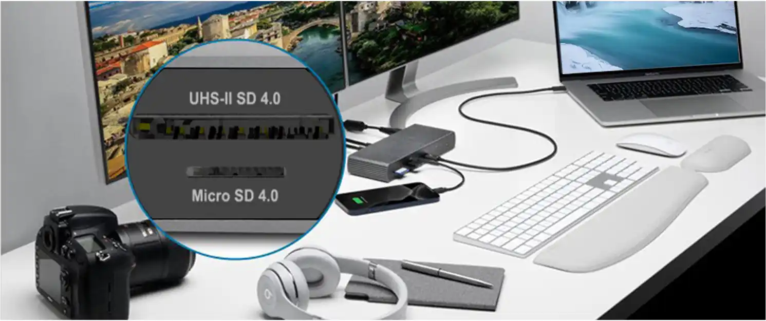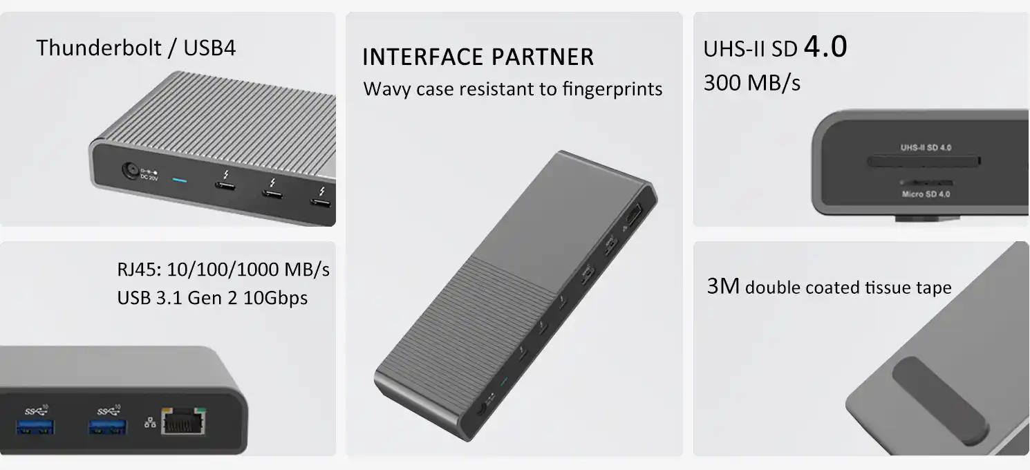 在这个坞站,你可以看到最创新的设计外型,充满先进的功能,支持Thunderbolt和USB-IF两种协议,解决您的端口不兼容的问题,40Gbps传输速率,SD 4.0读卡器,快速4K视频传输,150W电源适配器。当然,适用于Windows和macOS的任何计算机。