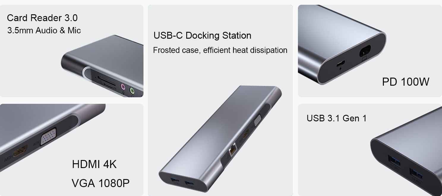 在这个码头,你可以看到完整的功能,支持USB-IF,解决您的端口不兼容的问题,有100瓦快速充电,HDMI [email protected]输出扩展,3个USB-A端口,足够您的桌面鼠标、键盘等设备连接,增加读卡器功能,快速存储和传输您的文件。当然,适用于Windows和macOS系统的任何电脑。