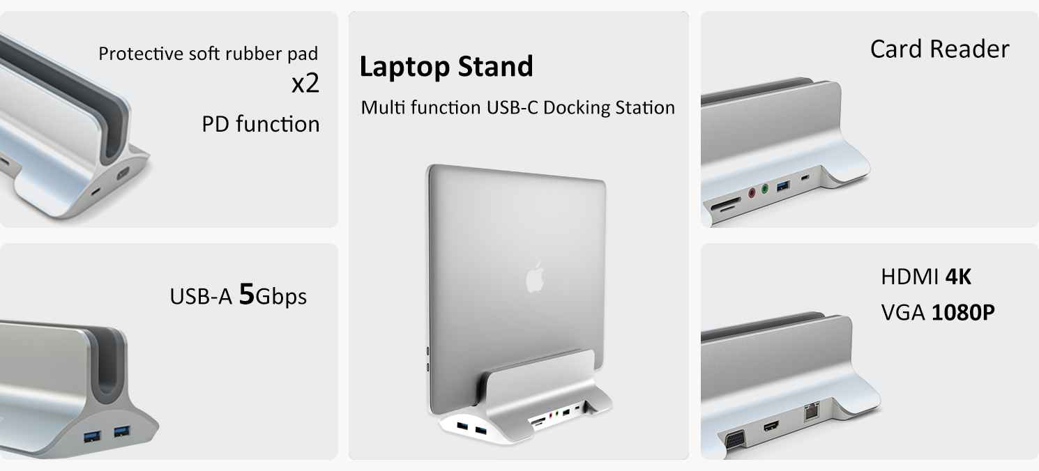无论你是在家里还是在办公室工作,这个USB-C对接站支持PD 100W,而不用担心电源供应。支持VGA、HDMI两屏视频输出扩展,最重要的是可以f放置空闲的笔记本电脑。